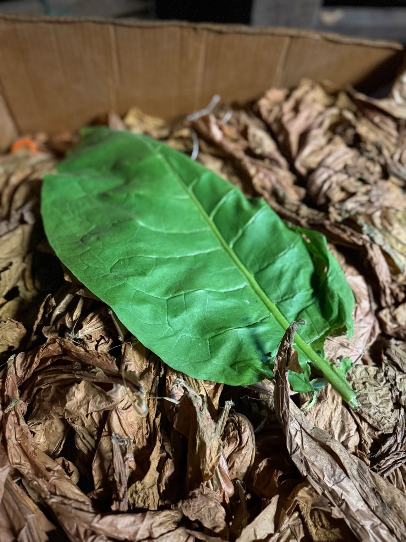 A freshly picked tobacco leaf on a pile of already fermented and aged tobacco.